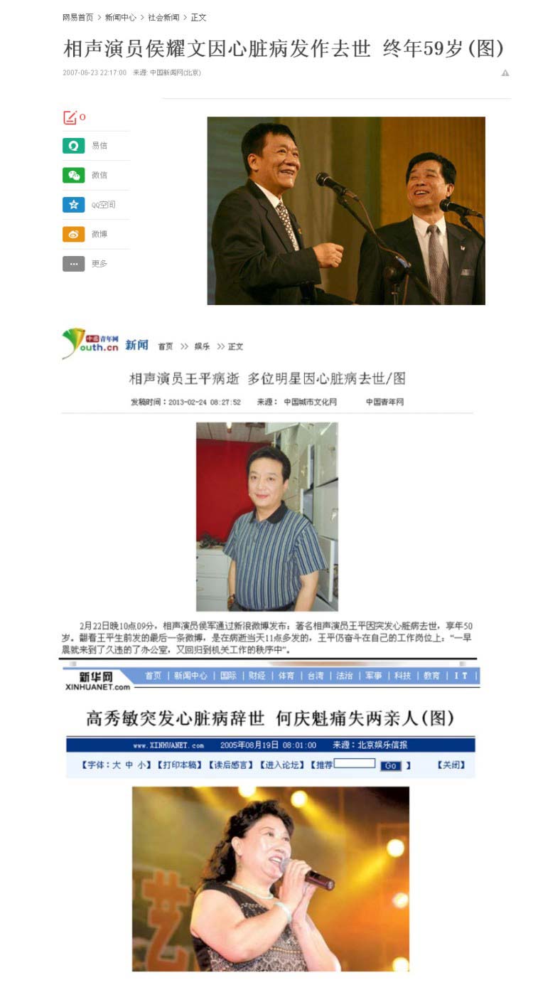 高秀敏、王平、侯耀文、古月……,这些一个个耳闻能详的明星们大都正是40多岁、50多岁的黄金年龄,正是事业、生活的巅峰时刻,生命却戛然而止,令人扼腕……